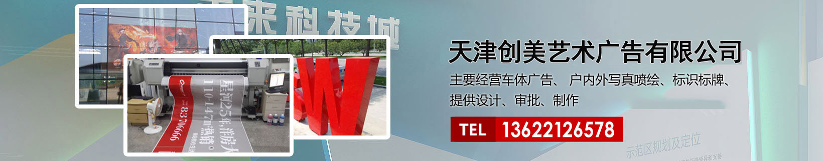 天津創美藝術廣告有限公司主要經營車體廣告、 戶內外寫真噴繪、標識標牌、提供設計、審批、制作、發布的服務。